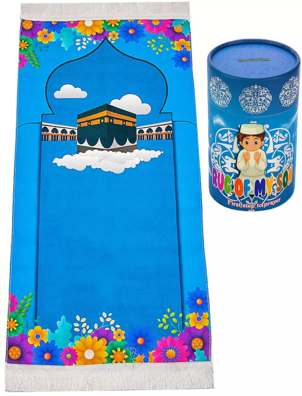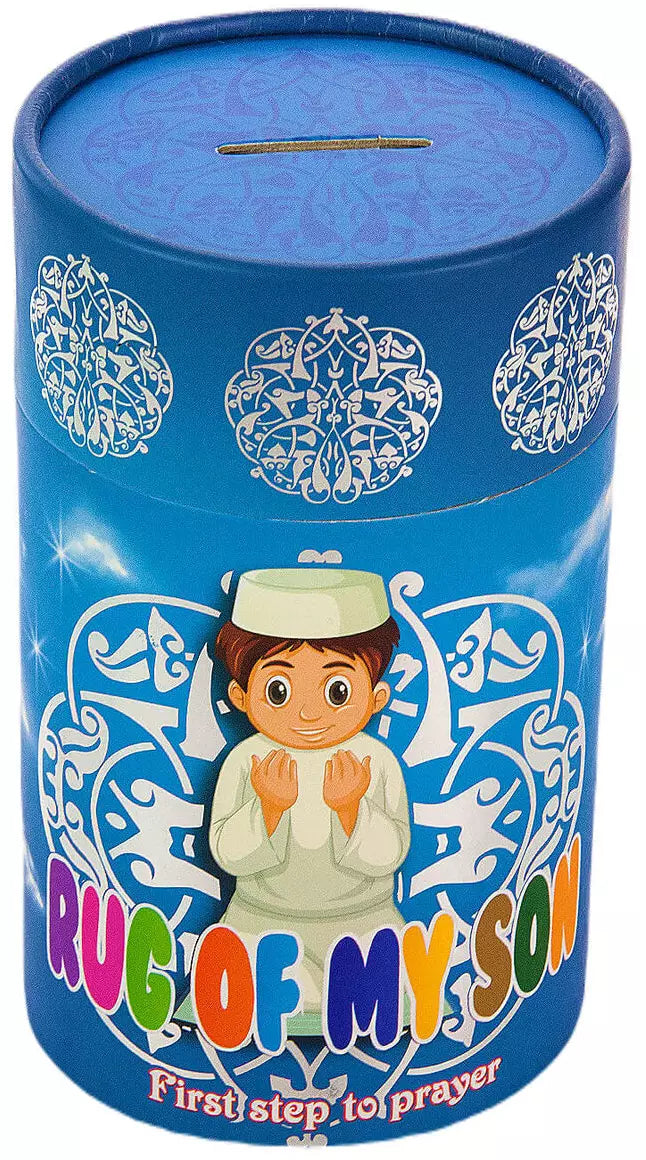 GREAT VALUE - The prayer rug set is designed for children. It will be a lot of fun to get your child used to prayer with this set. With the piggy bank feature in the cylindrical box, you can put a gift inside each time you pray and get your child used to praying.