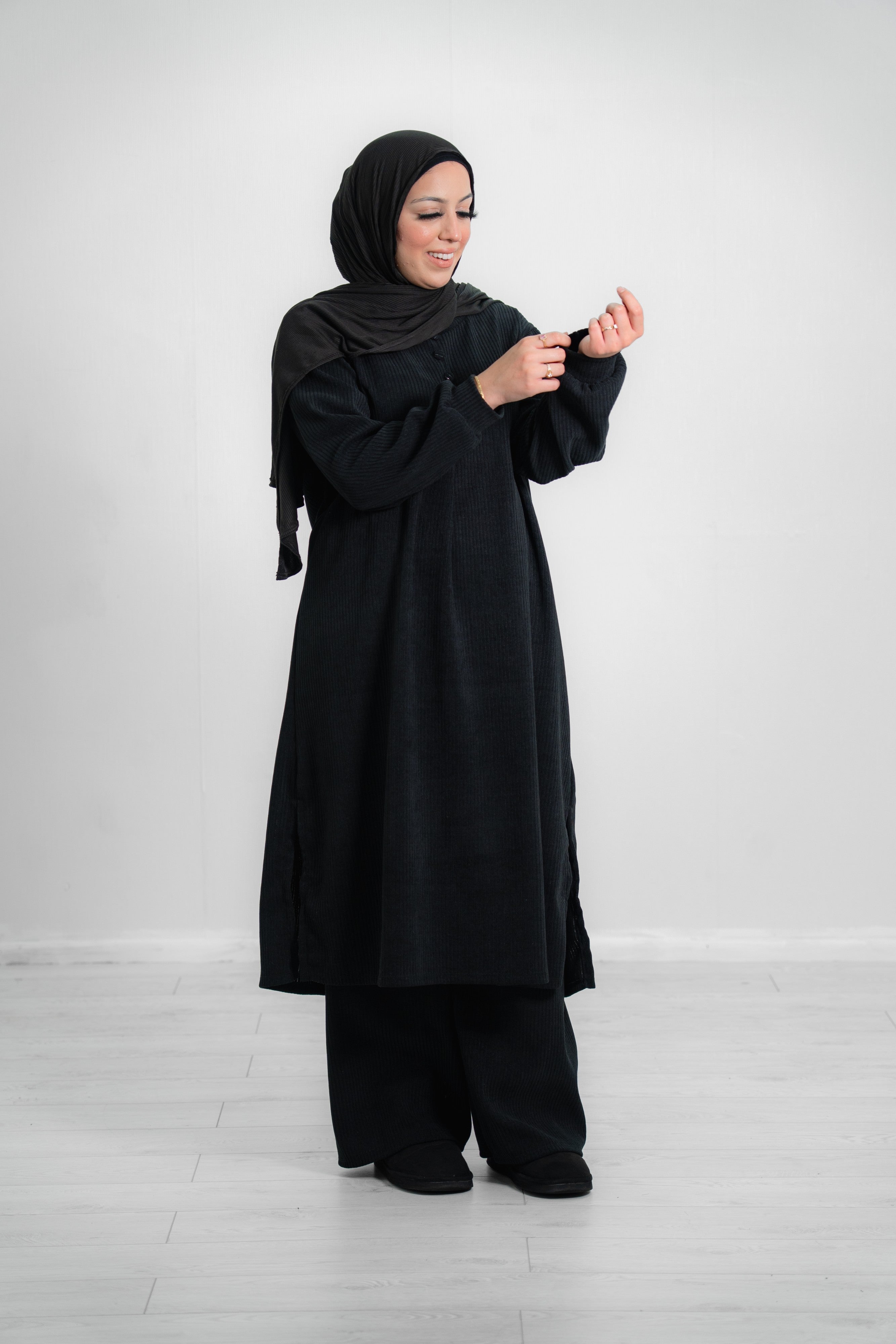 The long, modest abaya-style top features elegant button detailing and cuffed sleeves, adding a refined and stylish touch to your everyday look. Paired with matching wide-leg trousers, this set creates a flattering, streamlined silhouette that combines comfort and sophistication.