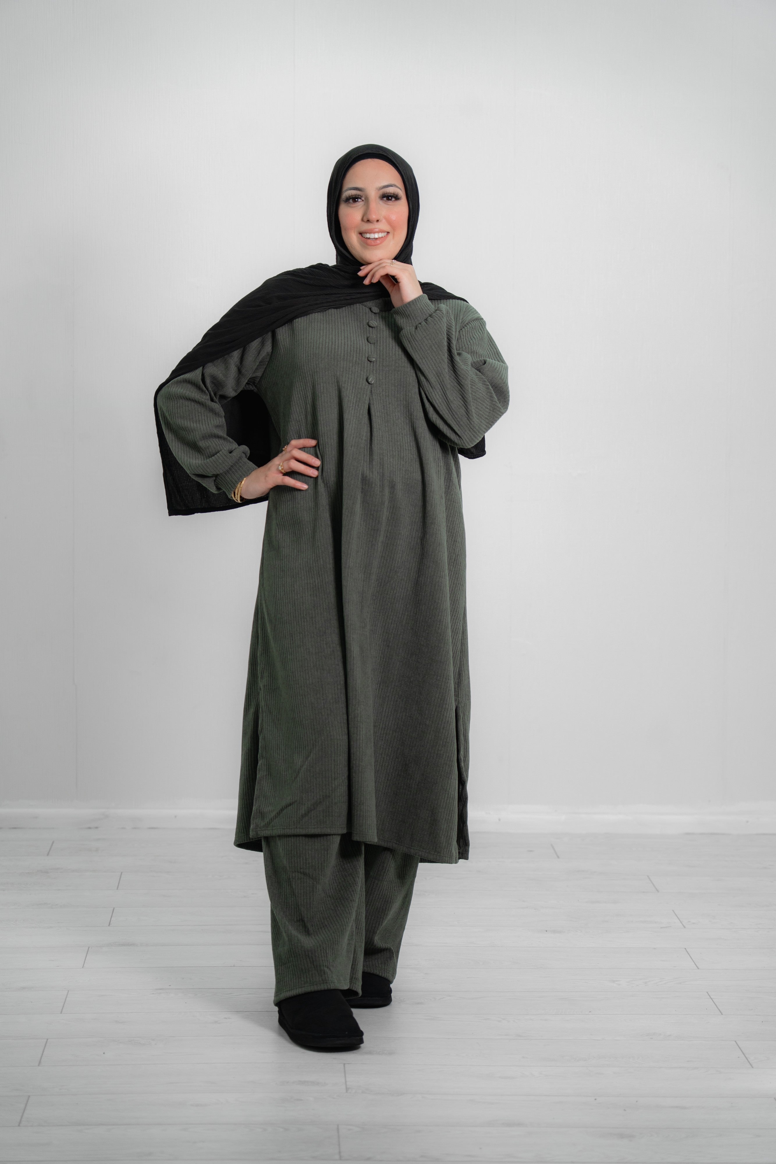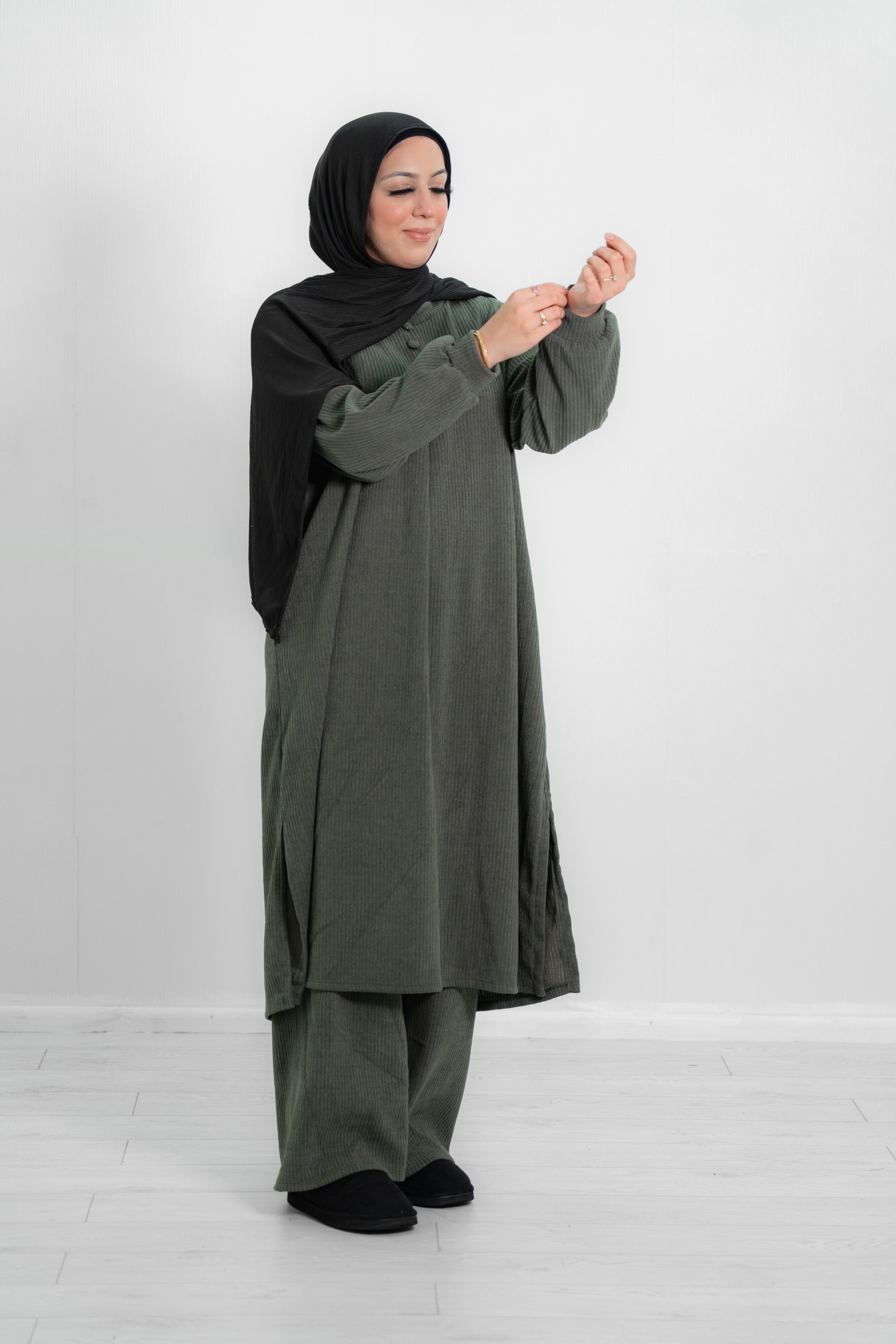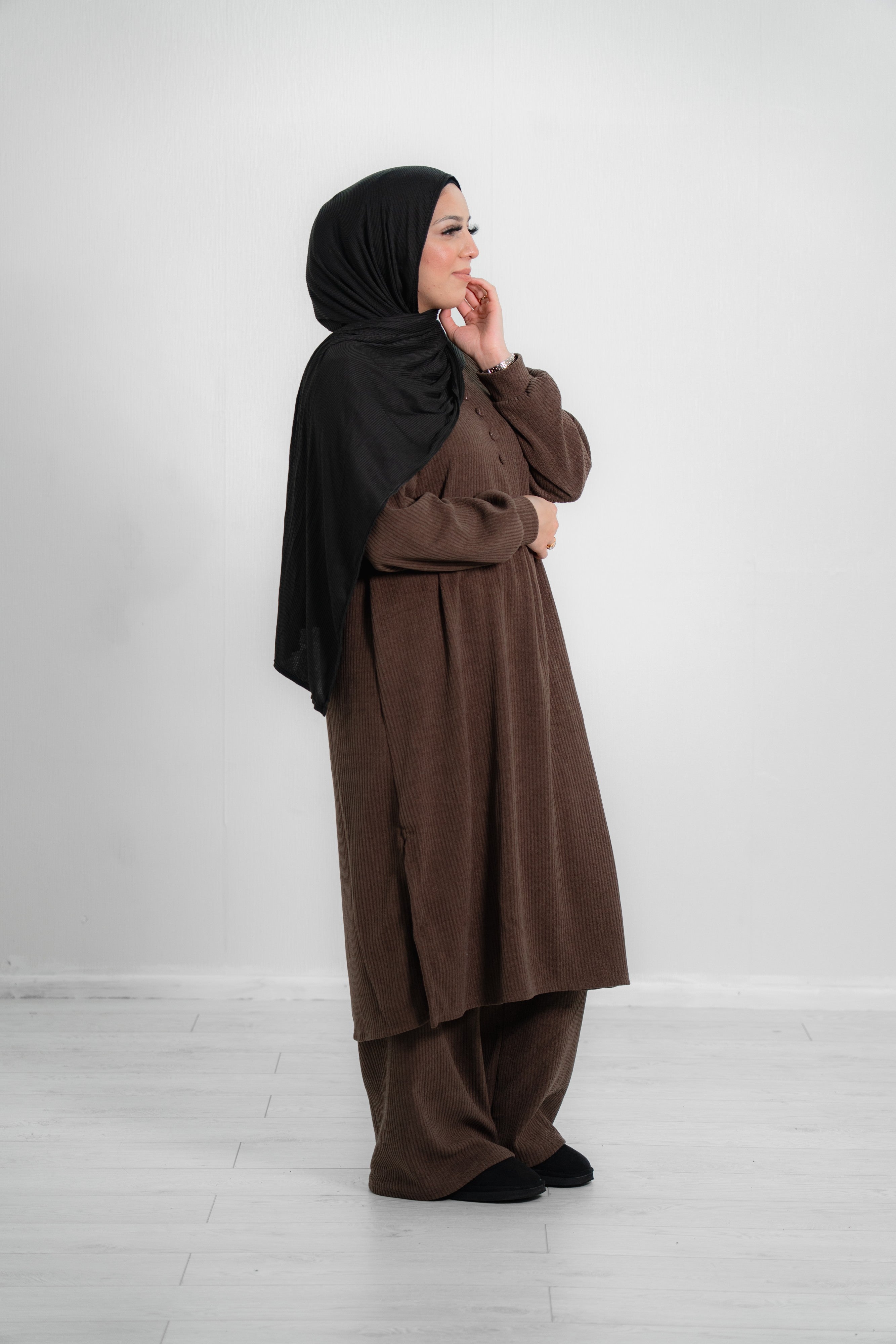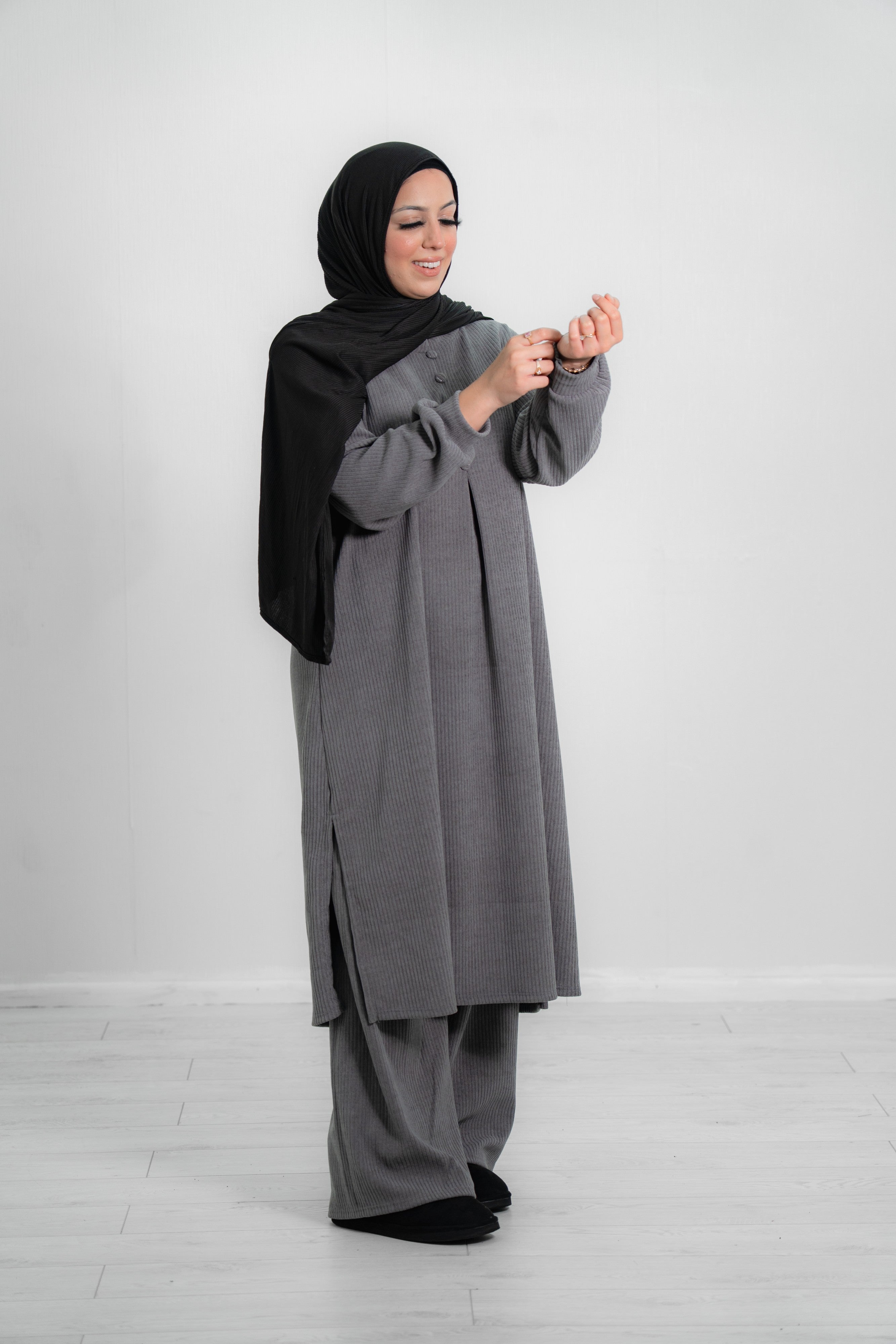 Experience the perfect blend of style, comfort, and modesty with this winter-ready ribbed cotton co-ord—your new wardrobe essential.