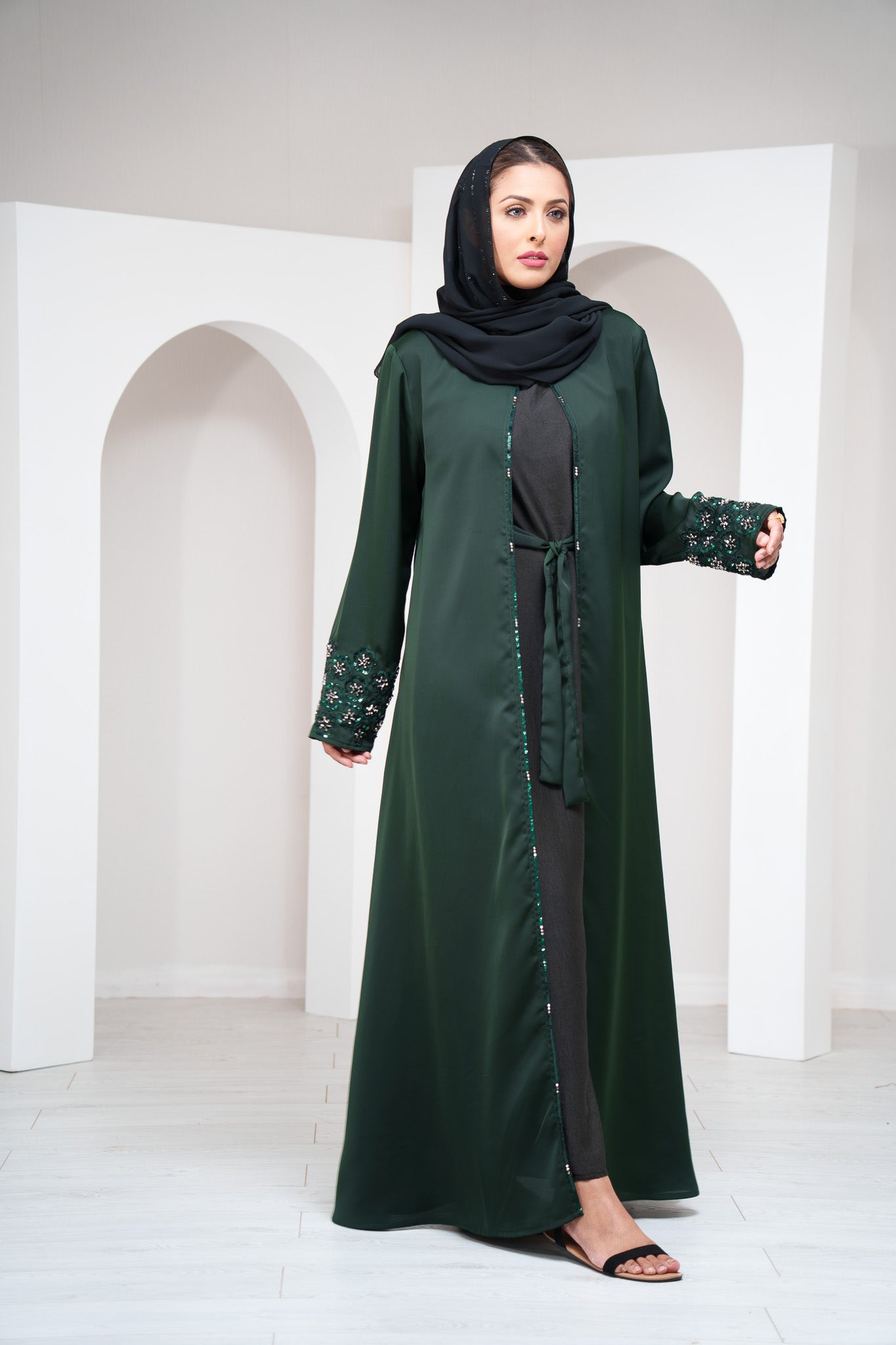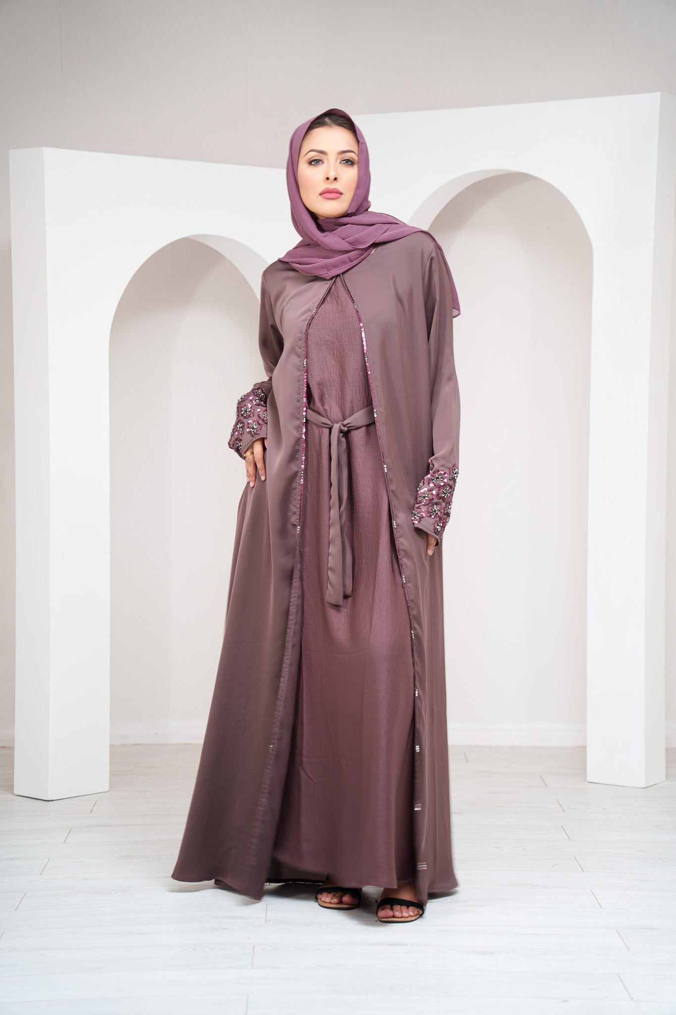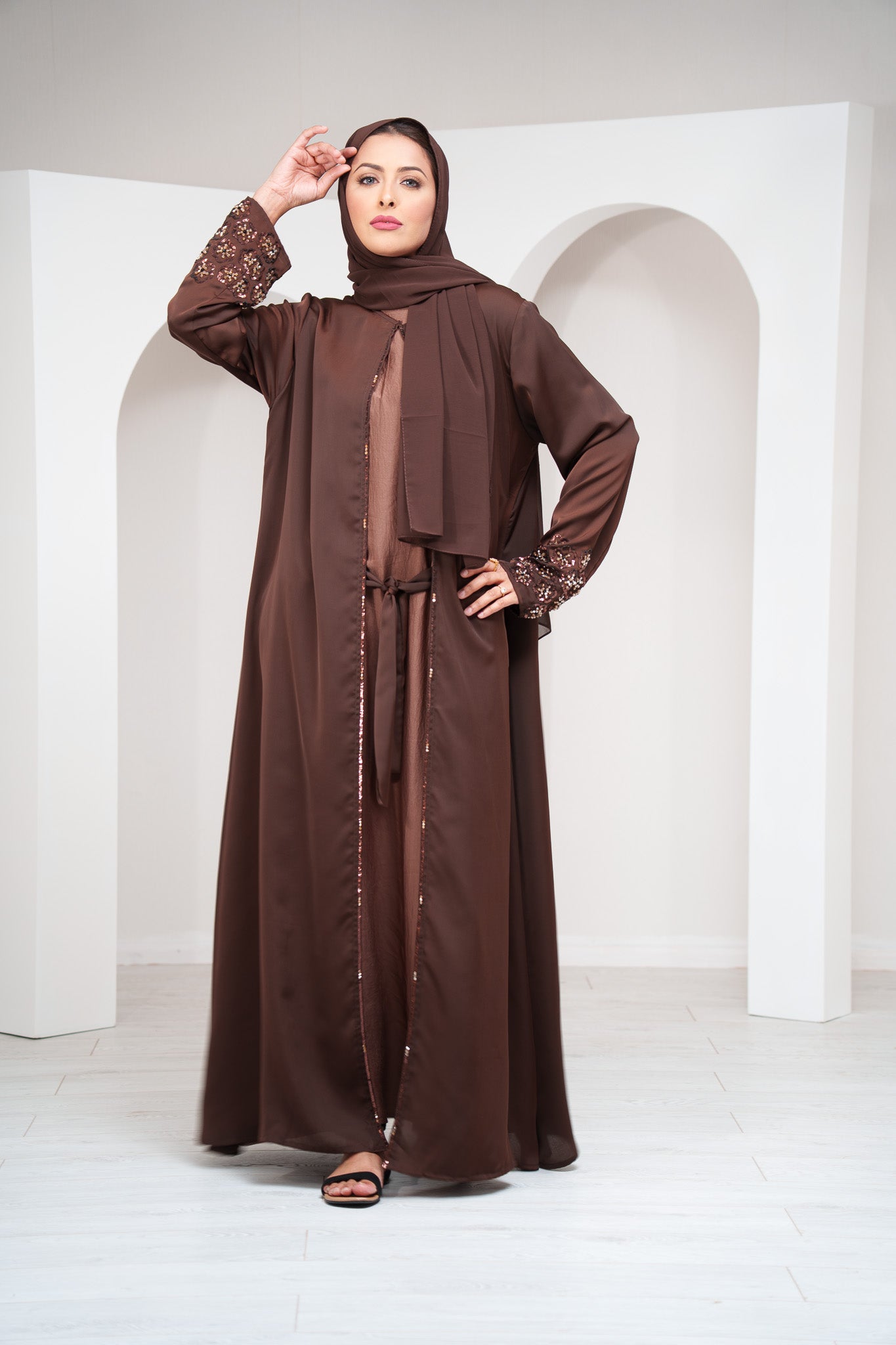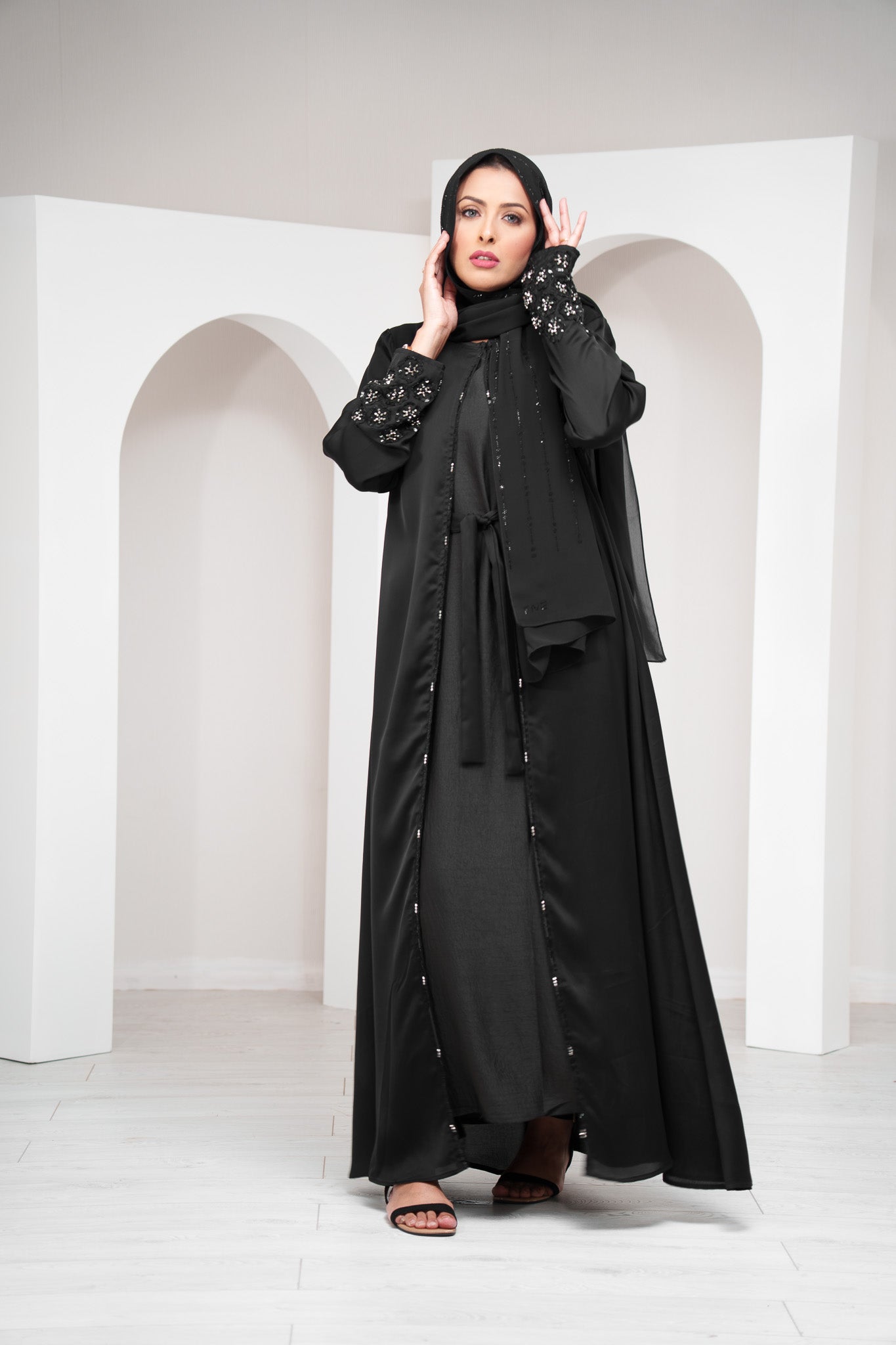 Add a touch of timeless elegance to your wardrobe with this women’s 2-piece satin/silk open abaya, crafted from luxuriously soft fabric with a smooth, flowing finish. This beautifully designed abaya features delicate sequin floral detailing on the sleeve cuffs, adding just the right amount of sparkle and sophistication.