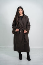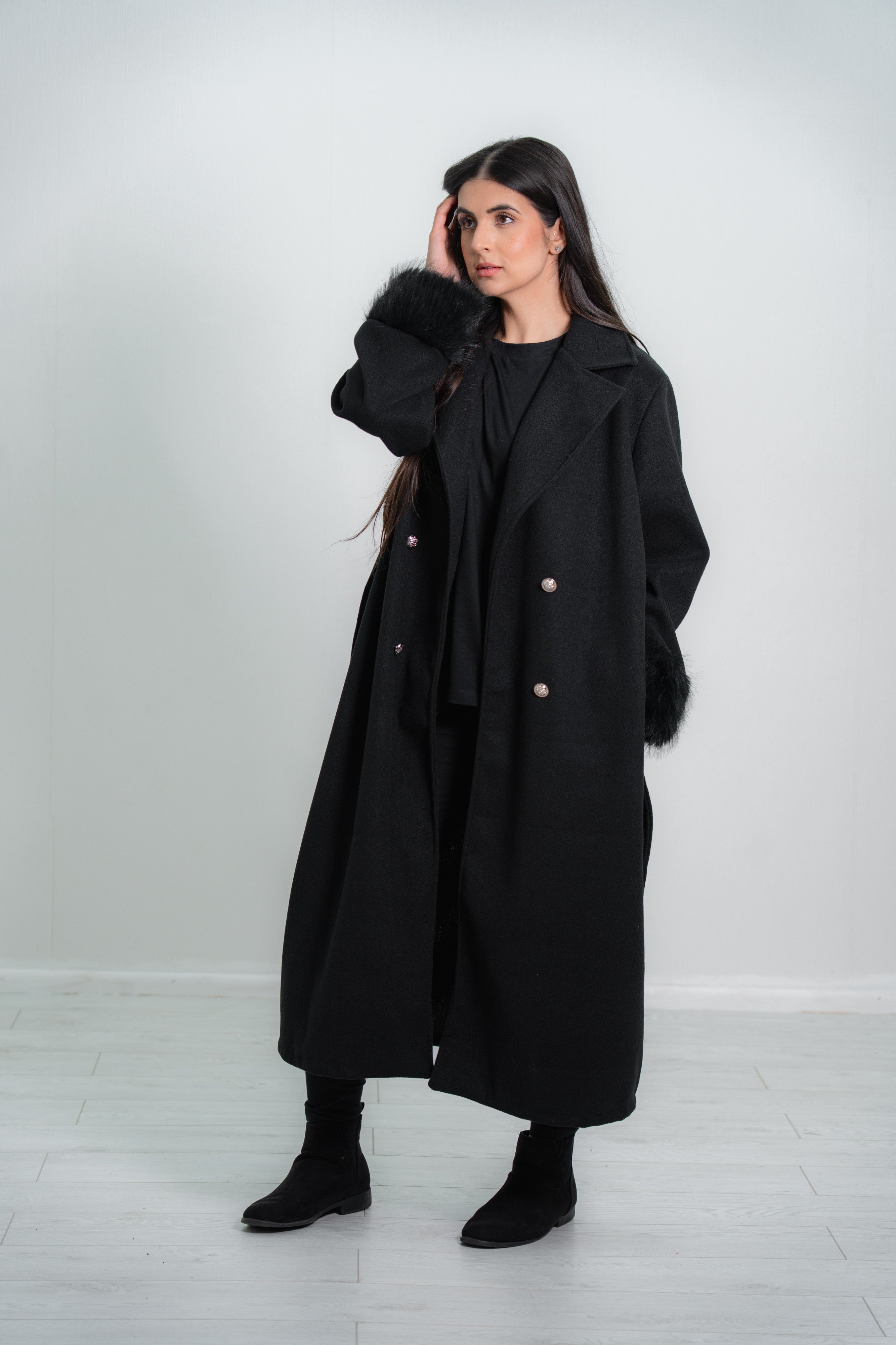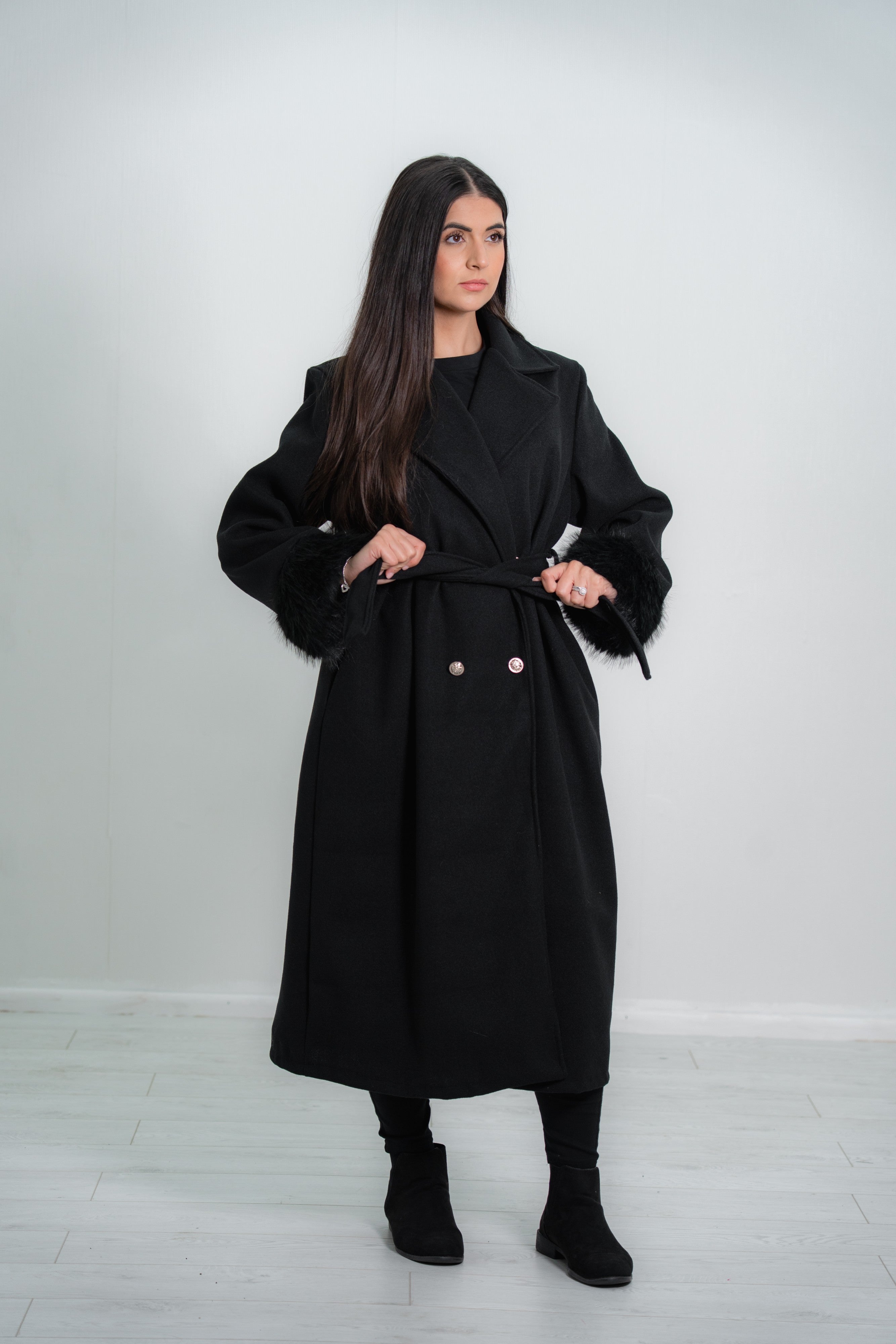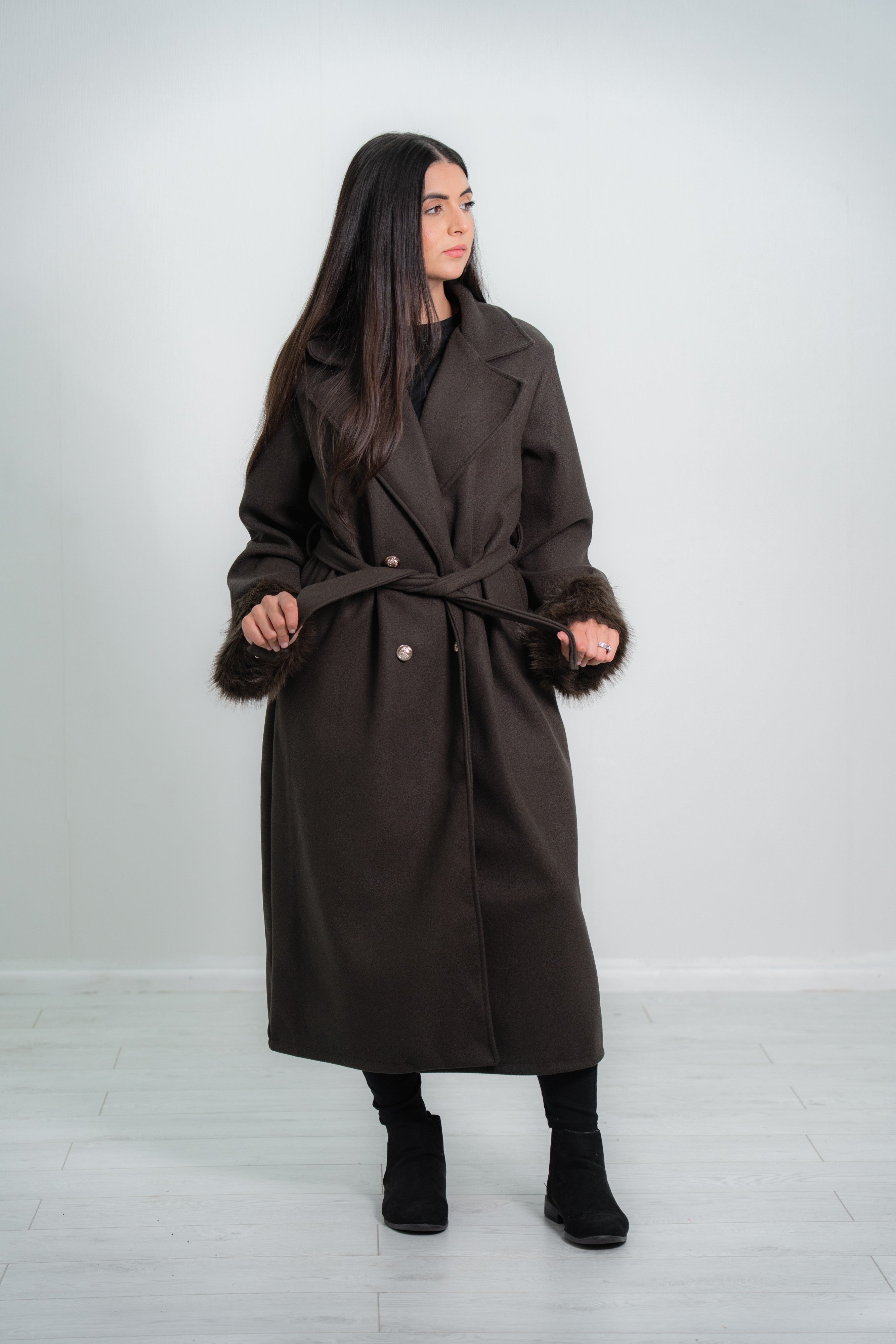 The luxurious fur cuffs add a refined, elegant touch, while the attached belt allows you to wear it cinched for a flattering shape or open for a relaxed yet polished look. With functional side pockets, this coat balances style and practicality, making it ideal for work, casual outings, or special occasions.
