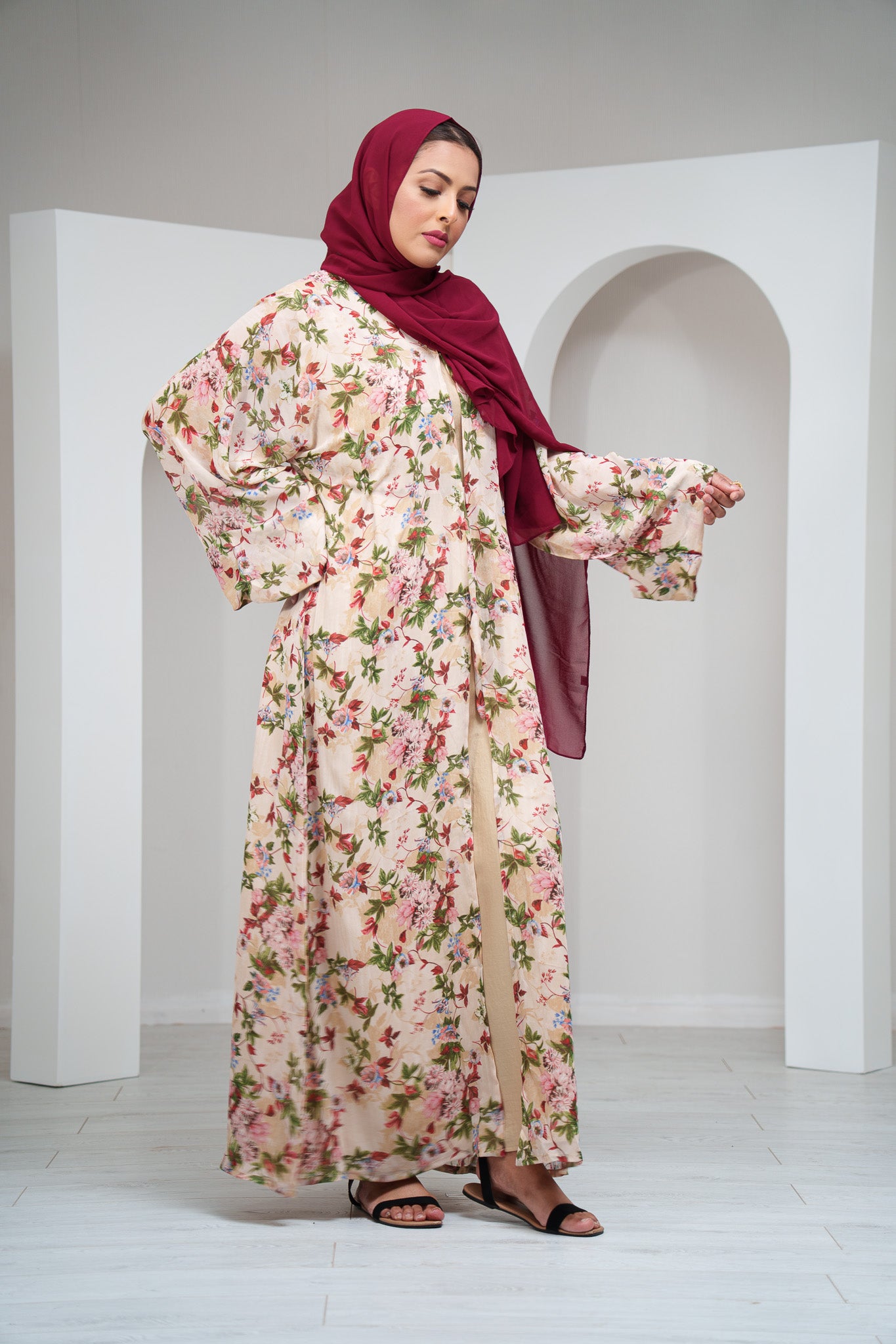 The design features a matching printed belt that adds a chic touch while letting you style the abaya open or cinched for a more defined silhouette. With its flowy movement and soft, airy feel, this abaya is your go-to piece for spring and summer outings, Eid celebrations, vacations, or casual gatherings.