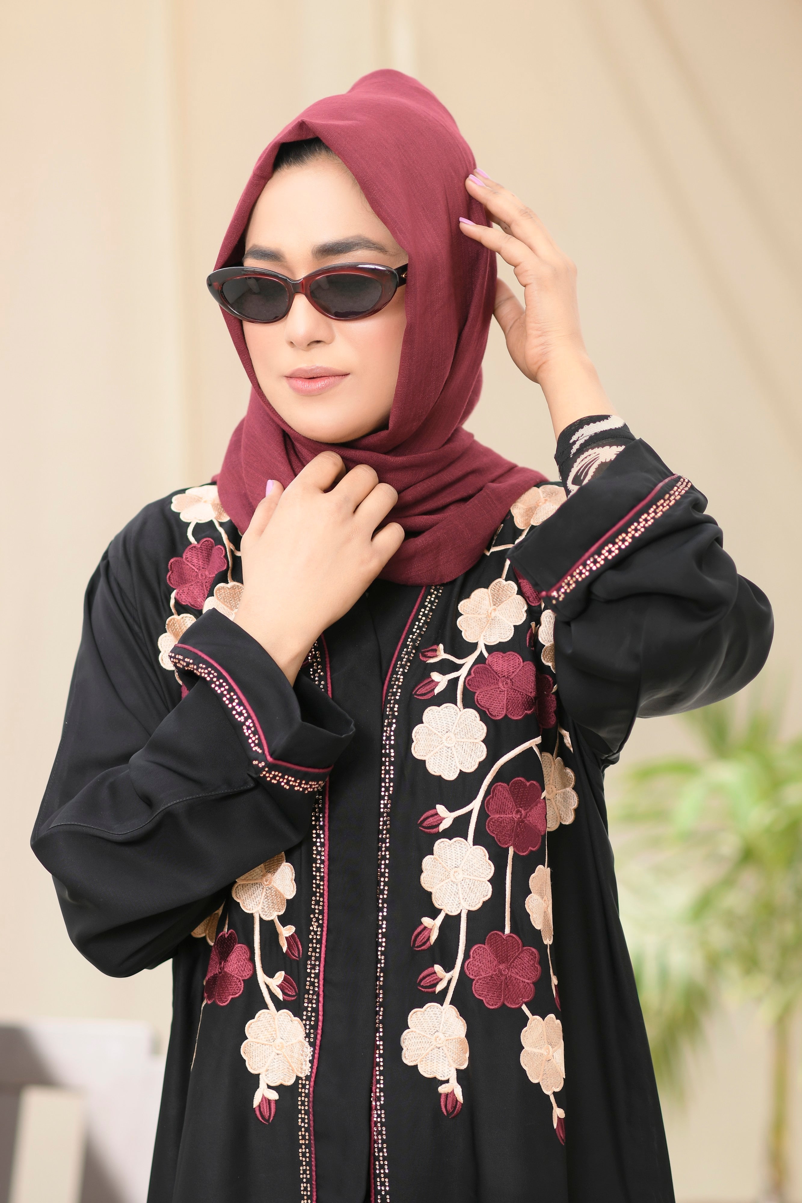 Intricate stitched floral embroidery runs throughout the entire abaya, adding a delicate and feminine touch