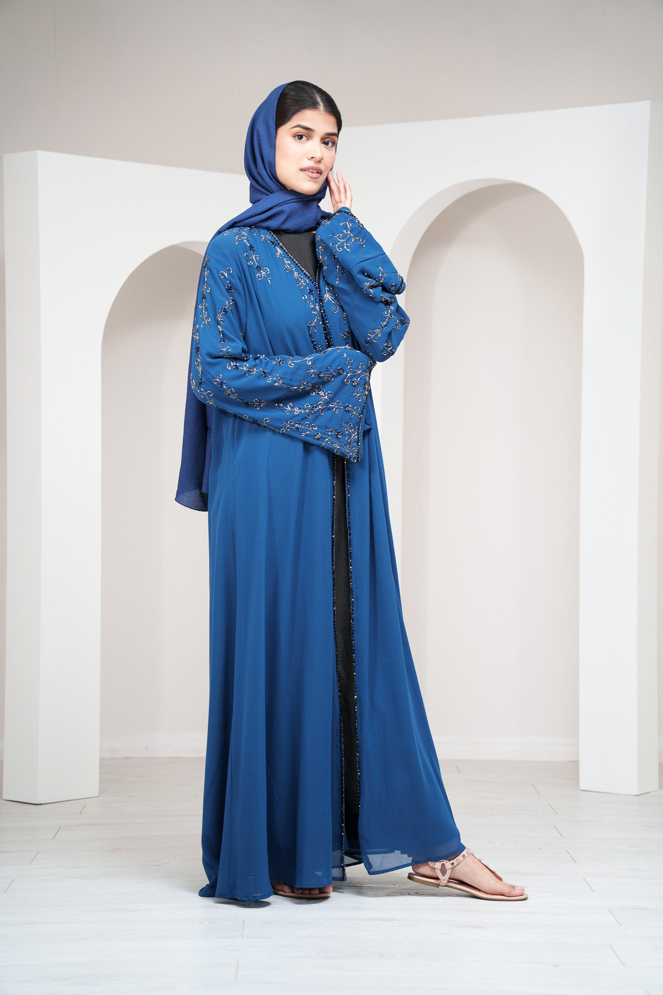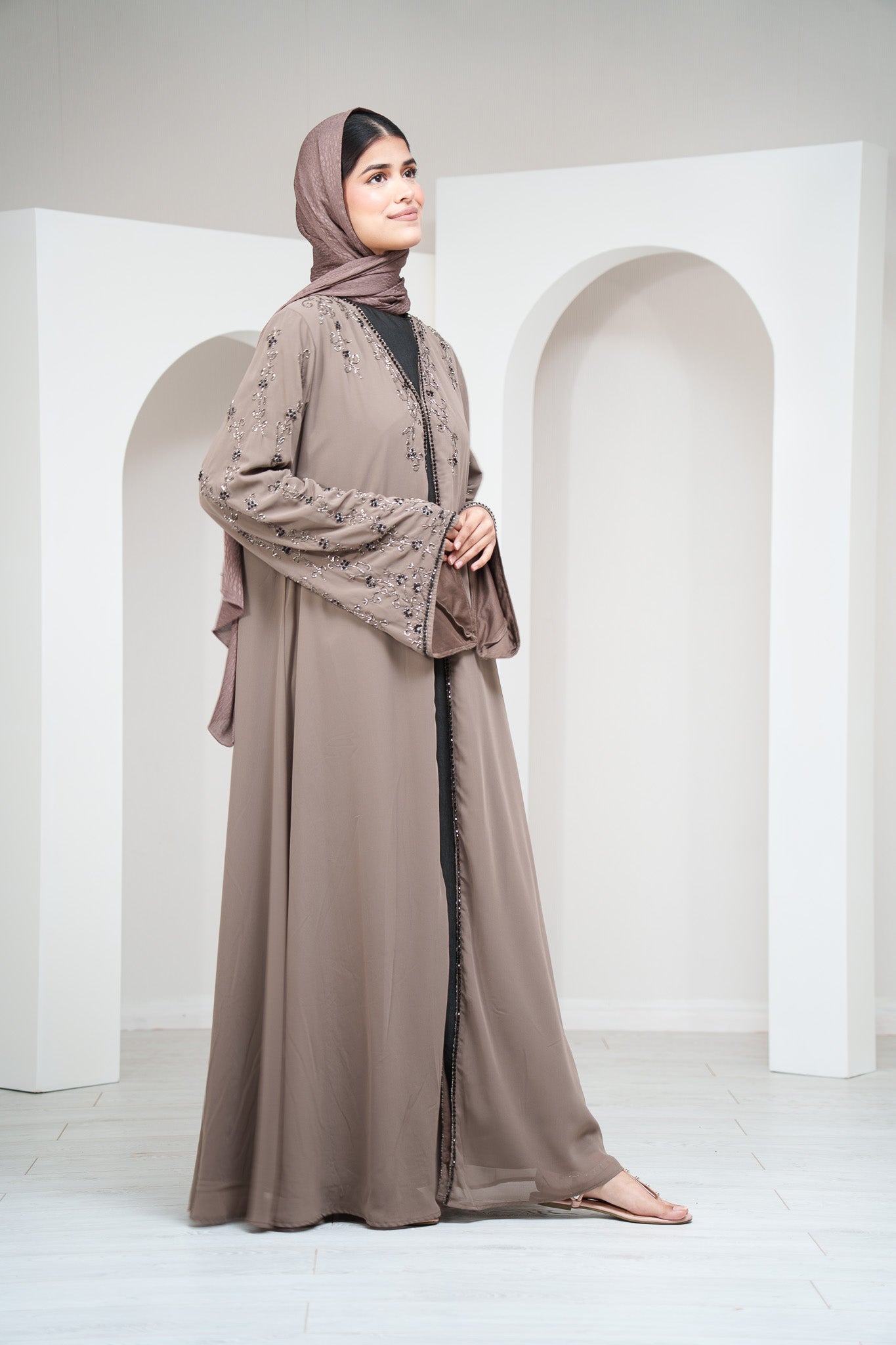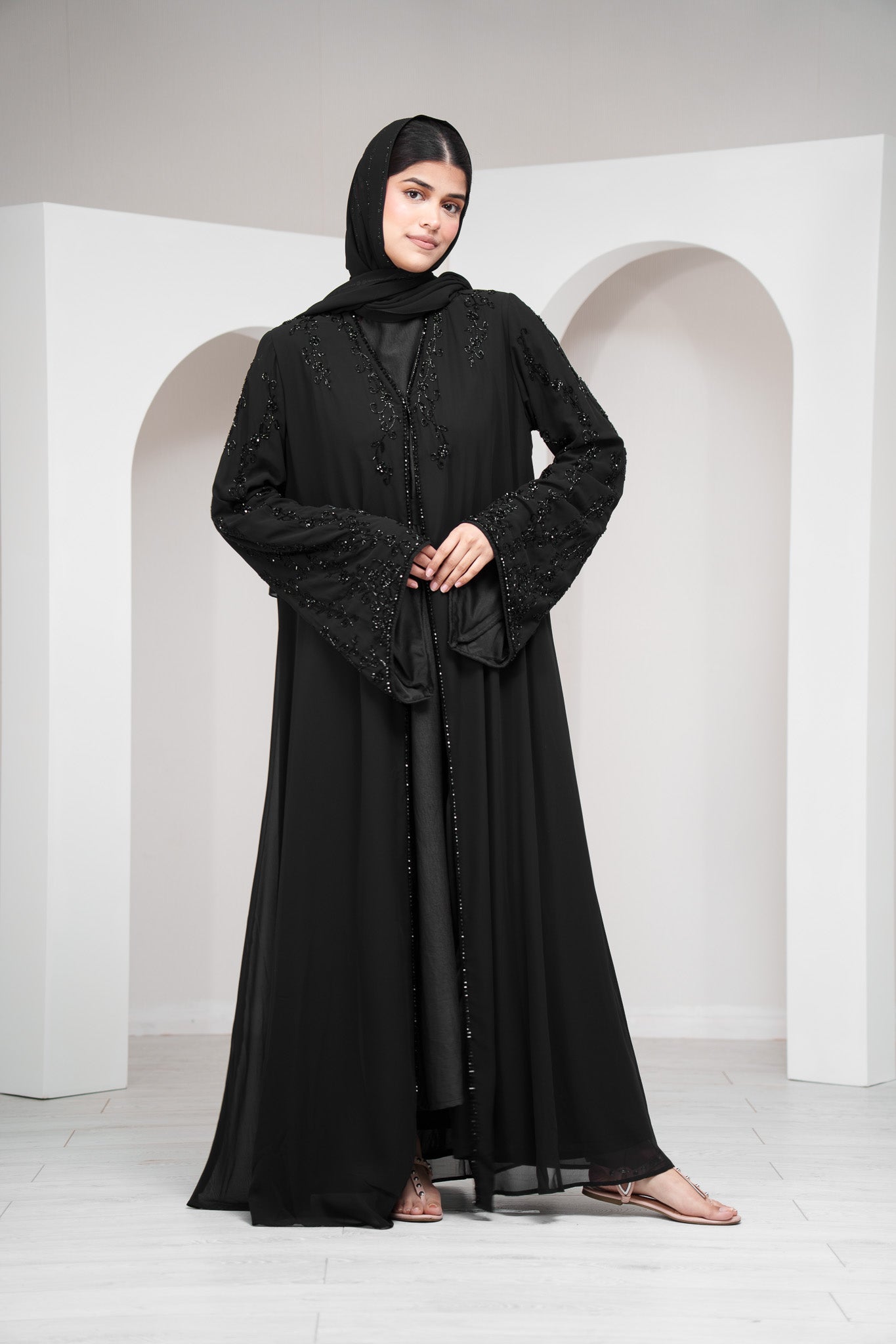 The dramatic cape sleeves add graceful movement and a touch of glamour, while the intricate beaded embroidery throughout the design showcases stunning detail and artistry. Made with premium materials and expert stitching, this abaya is both elegant and beautifully made, perfect for weddings, Eid, formal events, or special occasions.