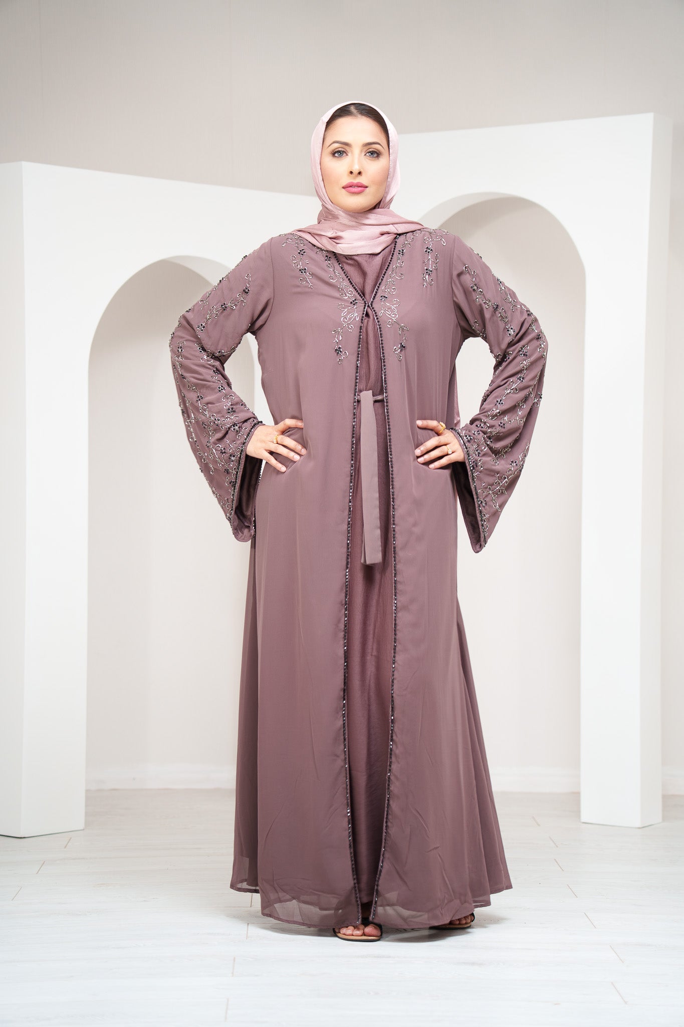 Step into timeless elegance with this women’s 2-piece cape sleeve abaya, featuring full beaded embroidery and a matching belt for a sophisticated, flattering finish. Designed for the modern modest woman, this statement piece blends traditional beauty with high-end craftsmanship.