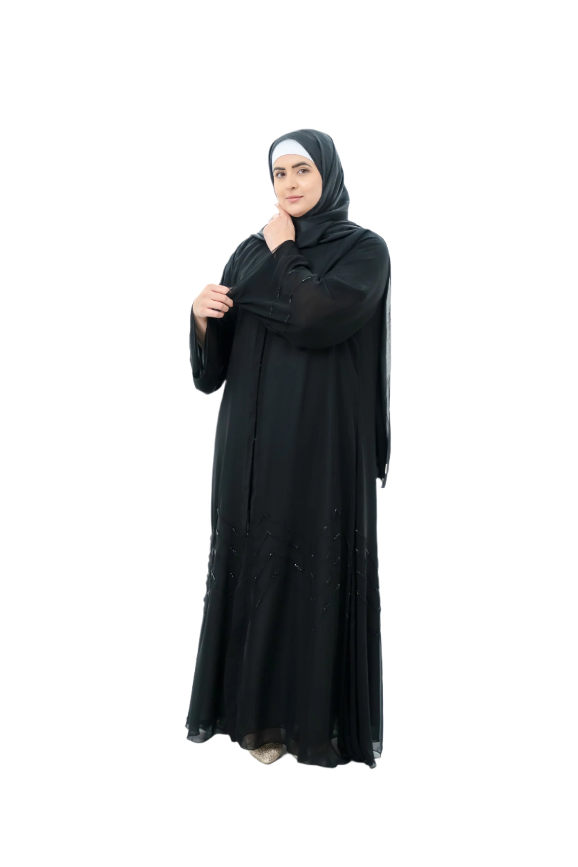 Available in four stunning colors—Maroon, Emerald Green, Black, and Peach—this abaya offers a versatile range of options for various occasions. Whether for a formal event, a special gathering, or an elegant evening out, the delicate beaded detailing brings a sparkling, feminine touch to the timeless silhouette.