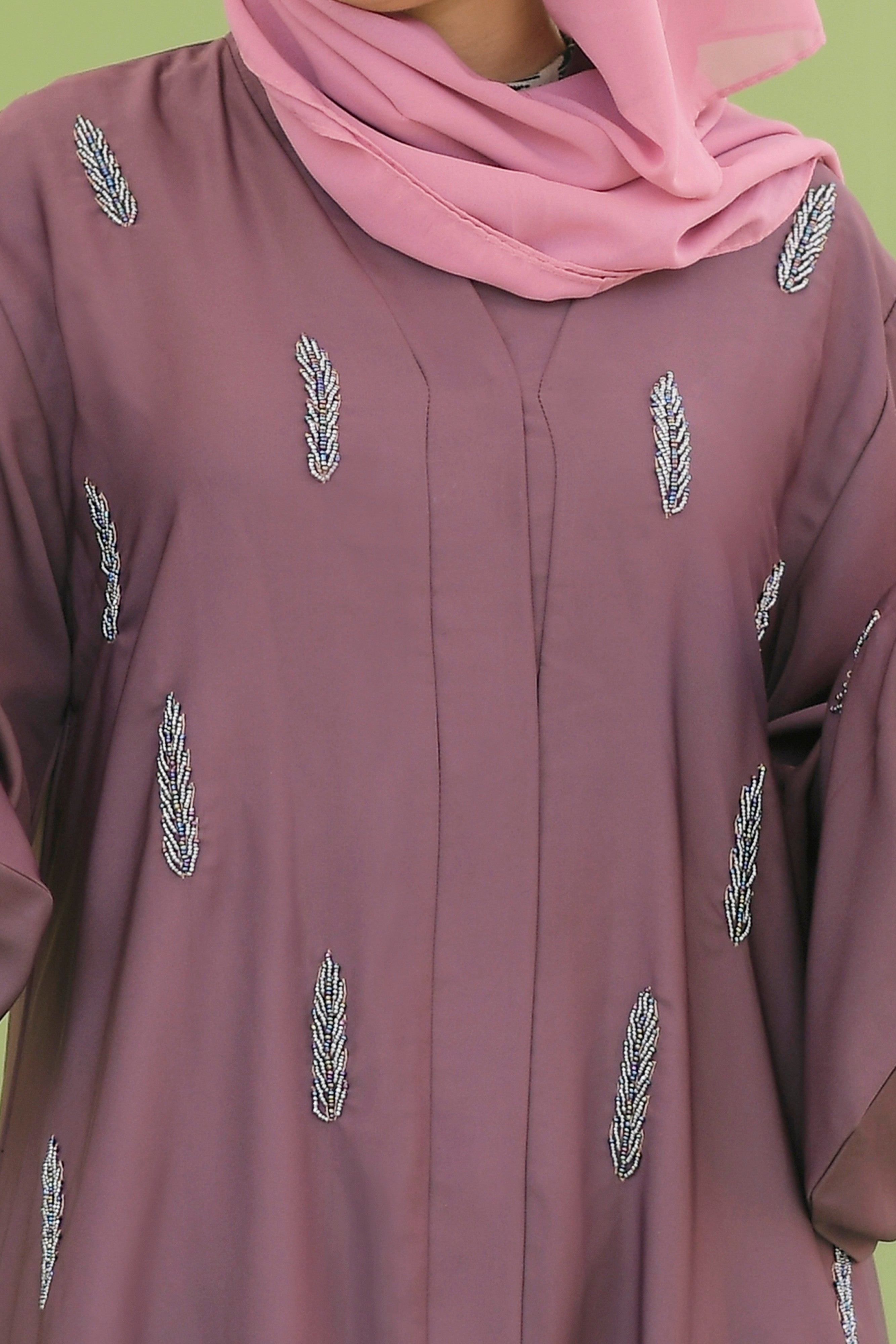 With a versatile button closure, this abaya can be worn open or closed, giving you multiple styling options for any occasion. The delicate beaded embellishments add a subtle yet refined sparkle, elevating the look for both casual and formal events. Perfectly stitched to perfection, this abaya combines high-quality craftsmanship with impeccable design.