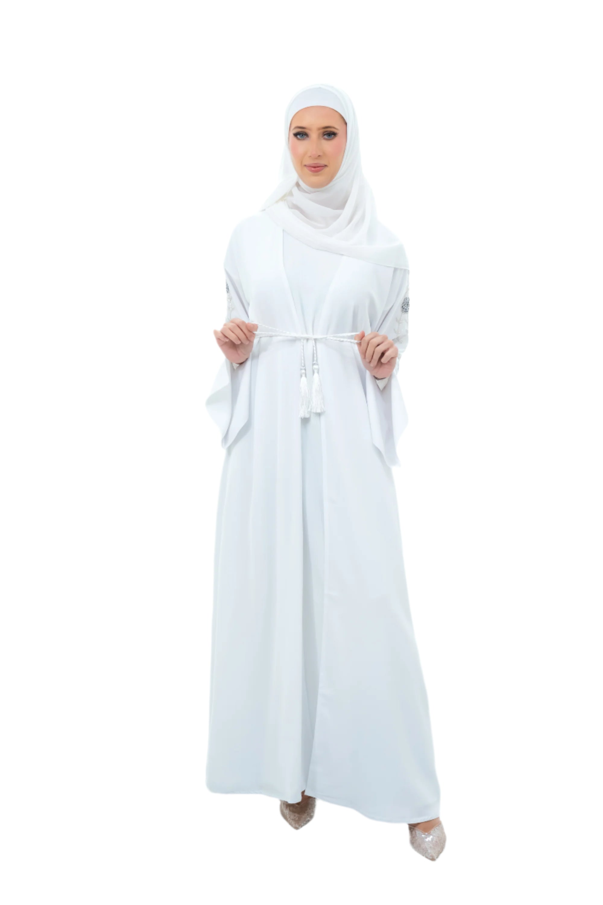 Available in four stunning colors—Peach, Taupe, Beige, and White—this abaya offers a versatile and timeless palette that complements various occasions. The inclusion of a matching rope belt allows for an adjustable fit, adding definition to the waist while enhancing the overall silhouette.