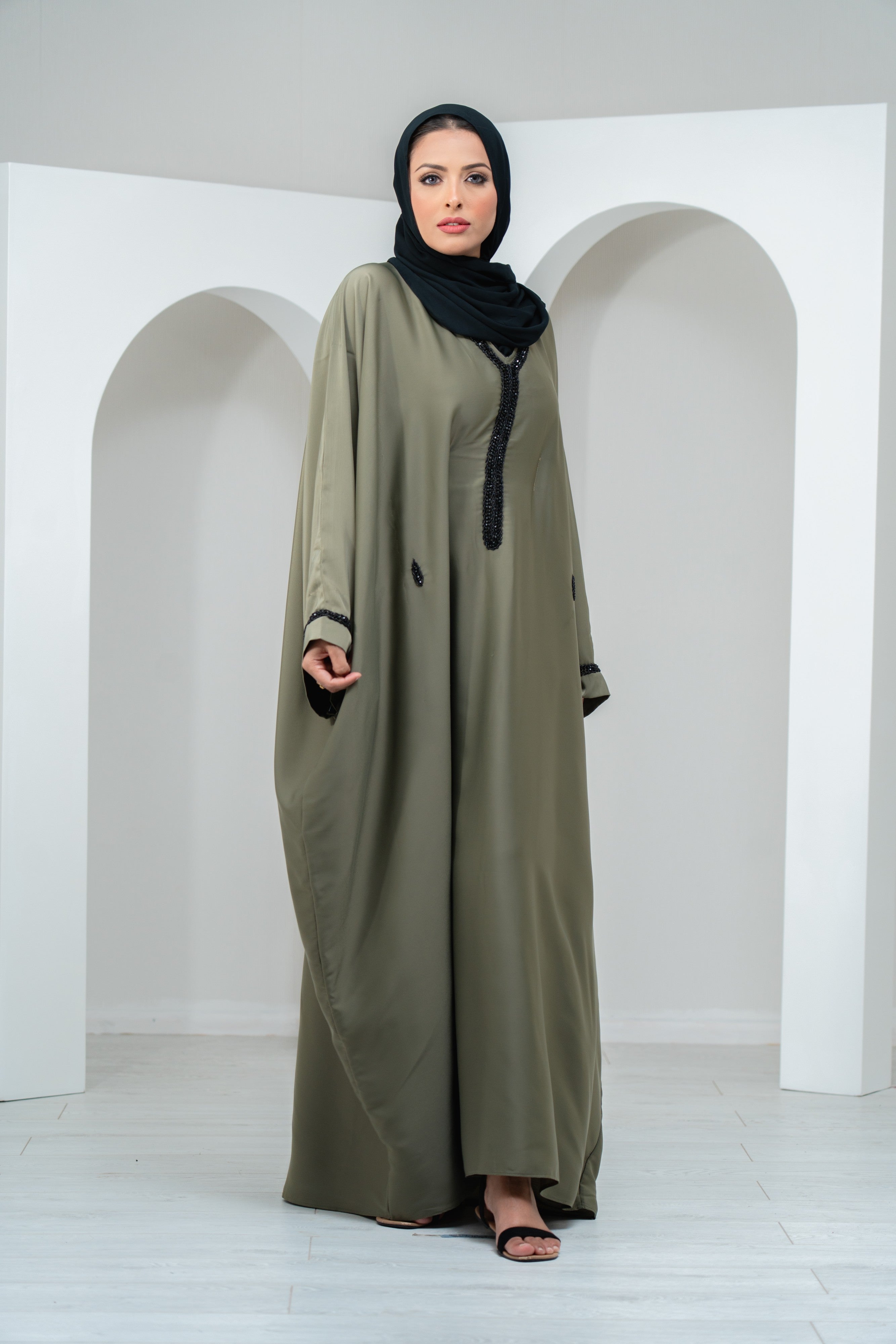 Perfect for weddings, Eid, or any special occasion, this satin kaftan with beaded details is a timeless addition to your modest wardrobe.